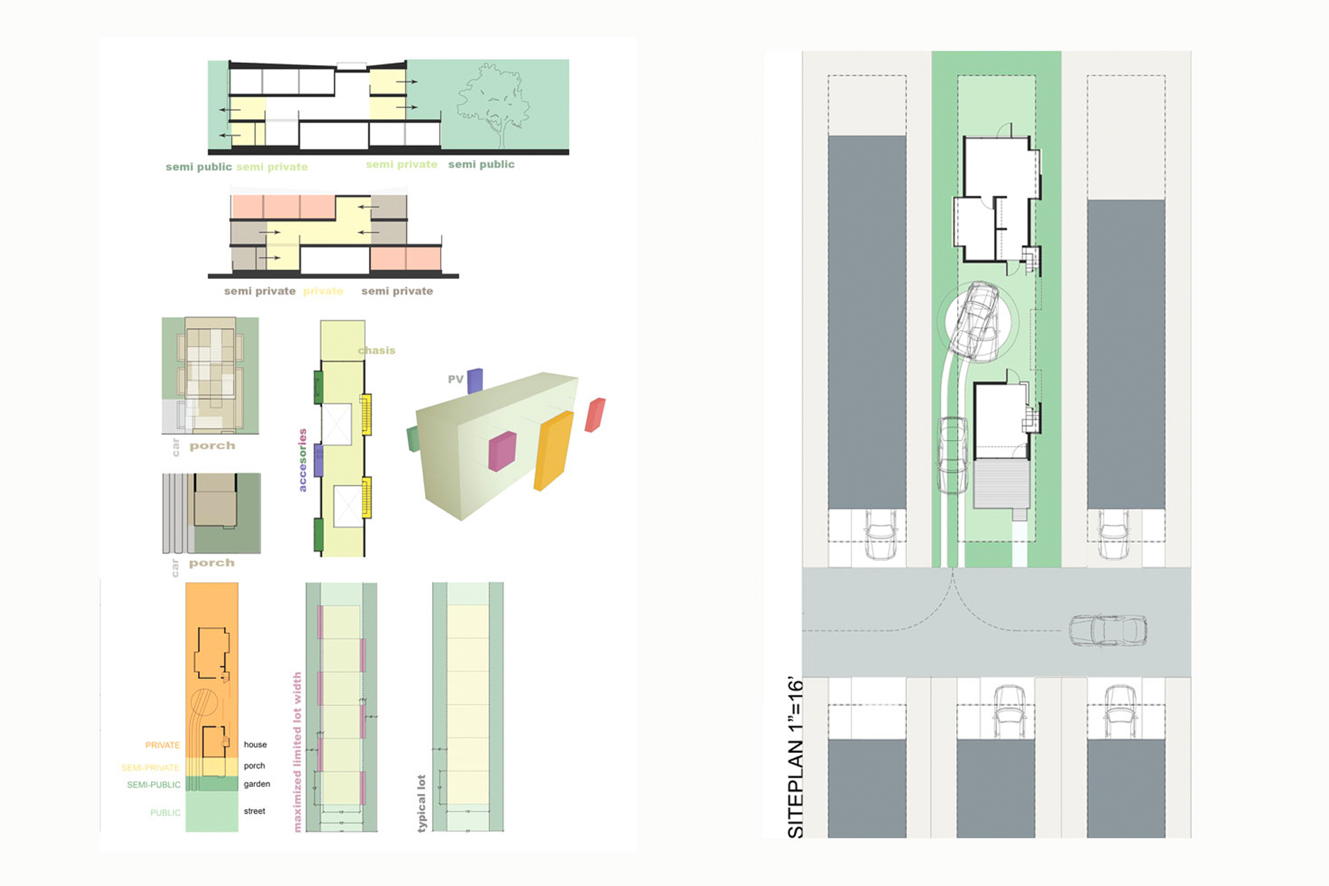 We proposed to construct a 3-story, 3-bedroom house with 3-flex spaces to provide modern amenities, with a structurally insulated panel system (SIPS) while incorporating day-lighting and photovoltaic panels (PV) to reduce consumption and energy needs, facilitated by the invention of an “autodisc” that allows the car to be conveniently garaged mid-lot via a driveway at the edge of the site without having to consolidate two lots to create a shared driveway, thus leaving enough room on a lot of limited width for a large porch to mediate between the house and the street and to create a positive pedestrian environment.