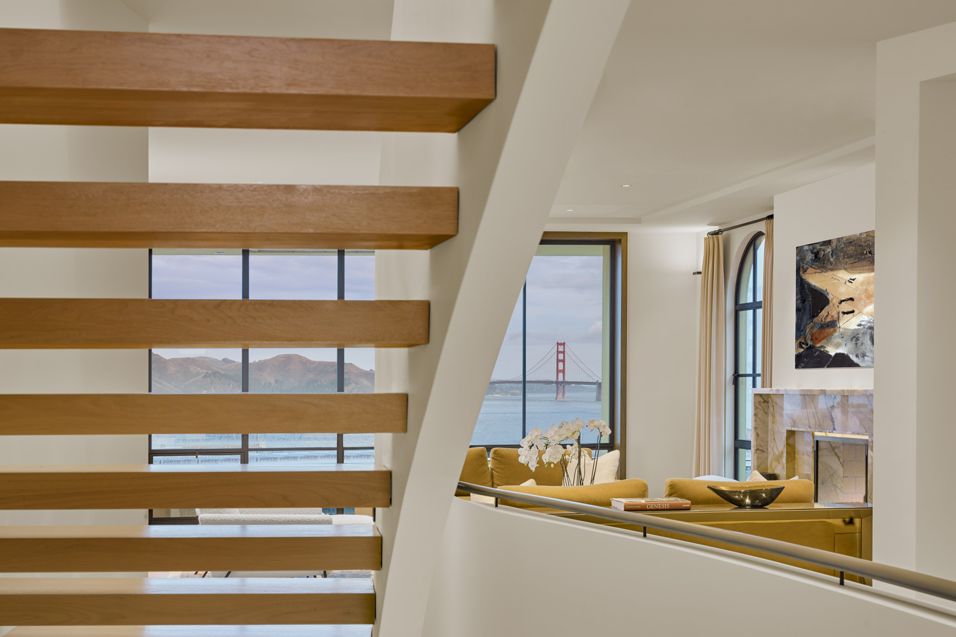 Aside from the practical aspects of connecting three floors of domesticity, it’s the vertical and essential counterpoint to the stacked horizontality of the house and is further accentuated with natural light from the large skylight that is also ellipsoidal, which brings in that special California light. The carefully proportioned treads with open risers allow light to reach further down while creating shadow play. They also allow for views from the library to the living room and to the iconic Golden Gate Bridge beyond. From an artistic perception. it's designed to be the poetic sculpture of the house - to be admired from above, below, and laterally in three directions. It constantly changes based on the viewer's position, changing light, and intoxication.