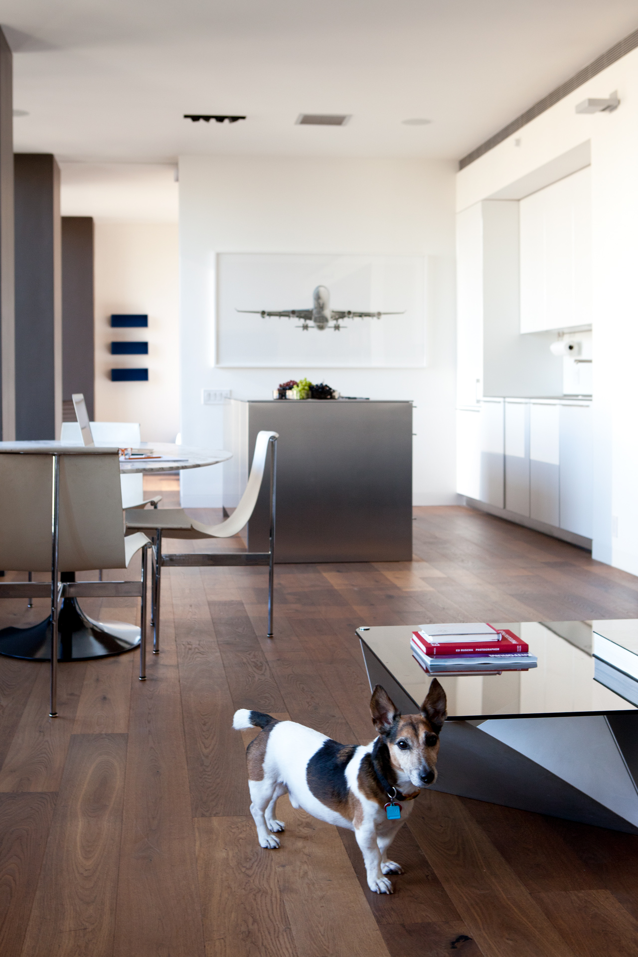 The furnishings are a mix of new and vintage. The sofa and lounge chair are new by David Weeks through Ralph Pucci, while the coffee table is 1970’s French in folded aluminum and glass. The credenza, also vintage 1970s, was made in Italy. The dining table is Saarinen with TG10 sling side chairs by William Katavolos. The kitchen is by Bulthaup, and the floors are wide-plank, Vulcano Oak by Mafi. The jet photograph in the kitchen is by Jeffrey Millstein, while the color photograph near the door, called “Poolside Gossip”, is by Slim Aarons.